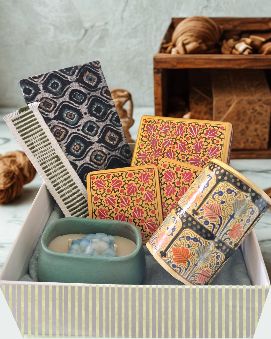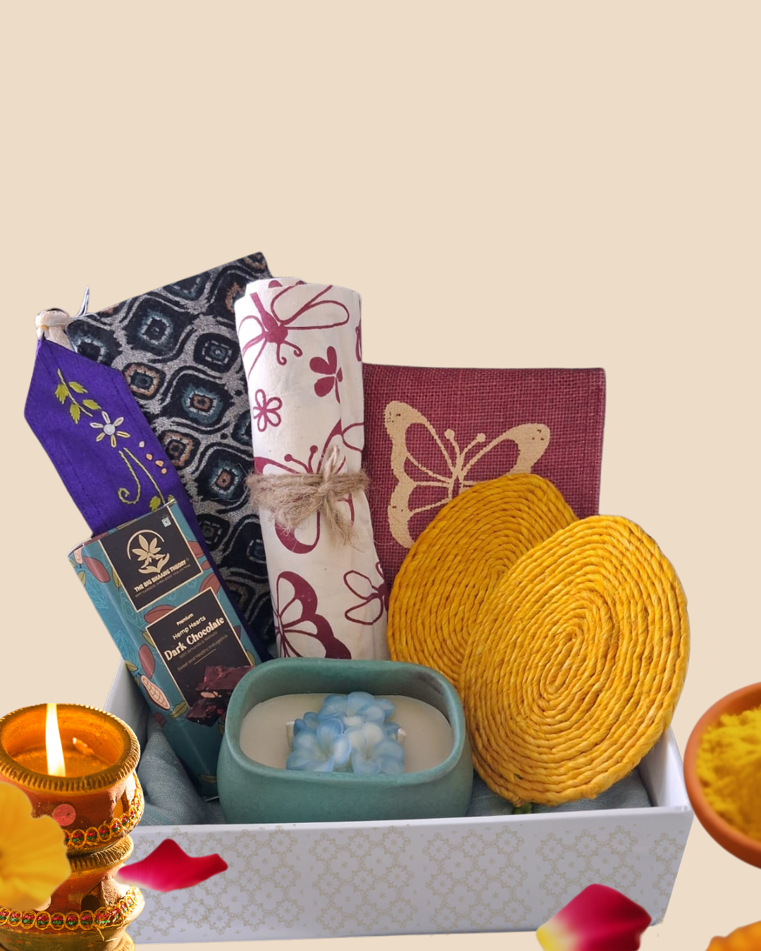 Items Included: Yellow handprinted travel/makeup pouch — handcrafted with care, vibrant and practical Terracotta handpainted...