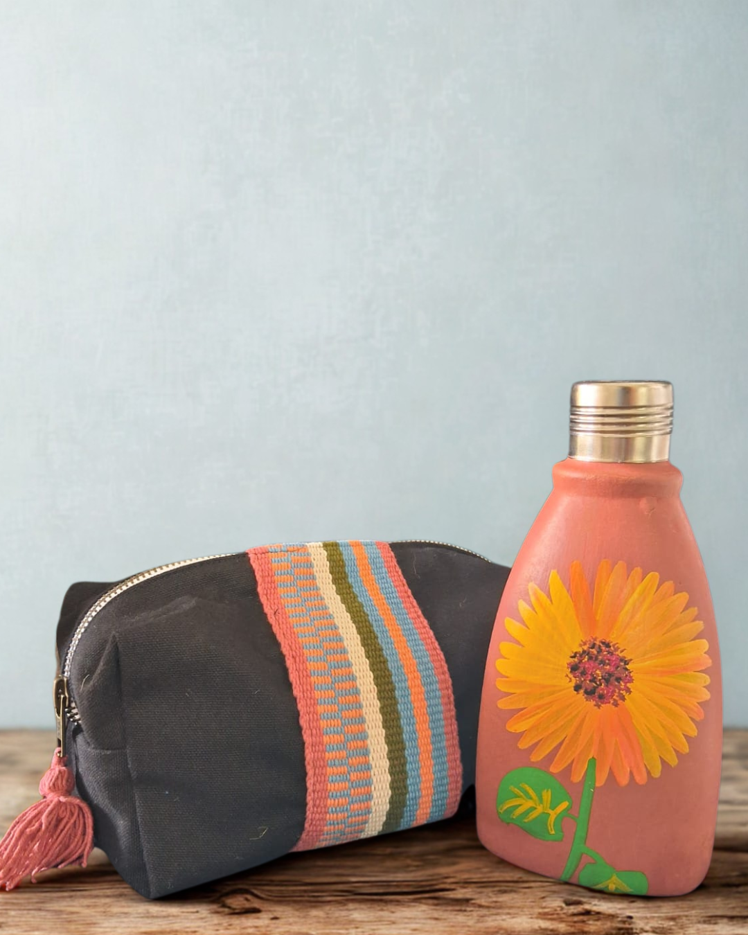 Items Included: Black handprinted travel/makeup pouch — sleek, handmade, and versatile Terracotta handpainted marigold bottle...