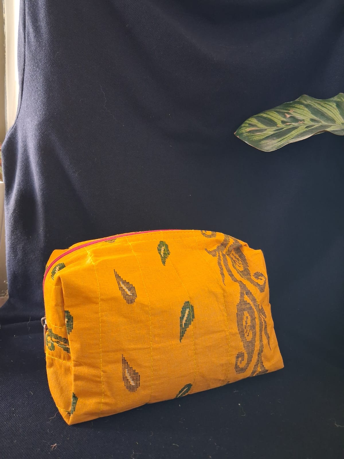 Yellow handprinted travel/makeup pouch — handcrafted with care, vibrant and practical