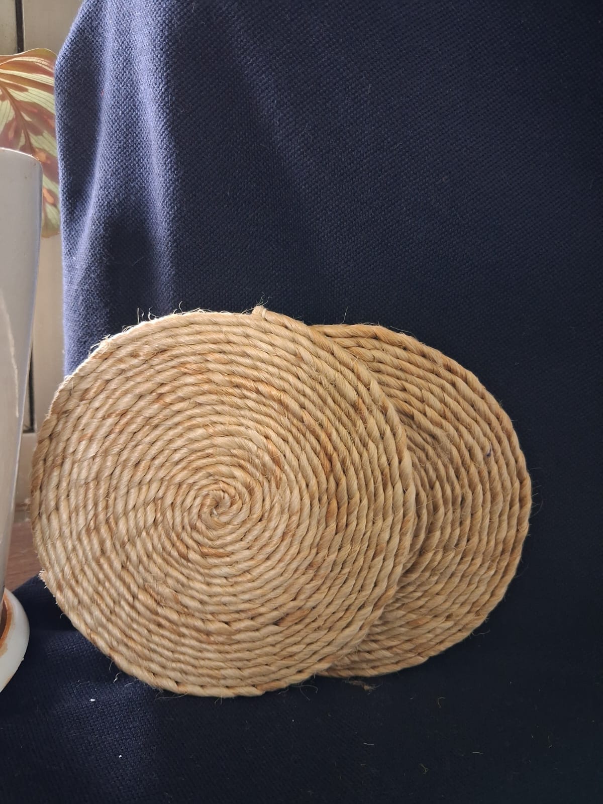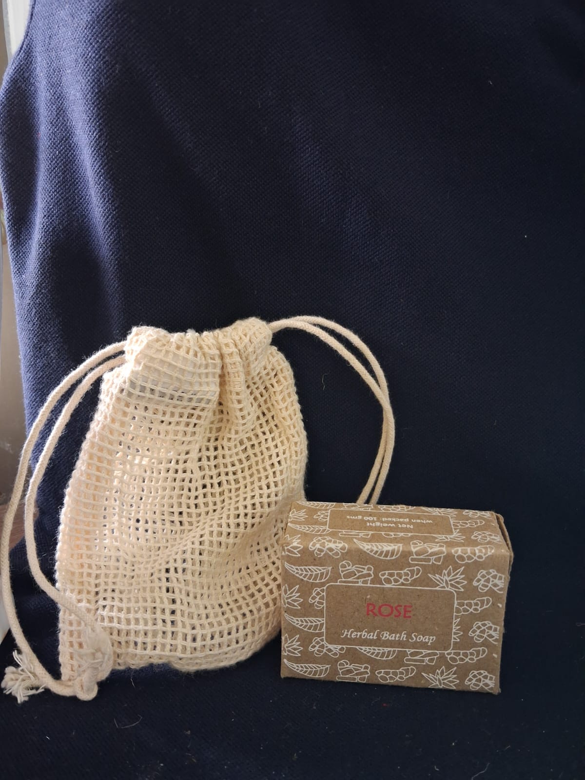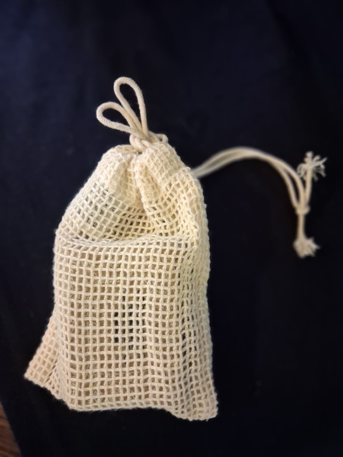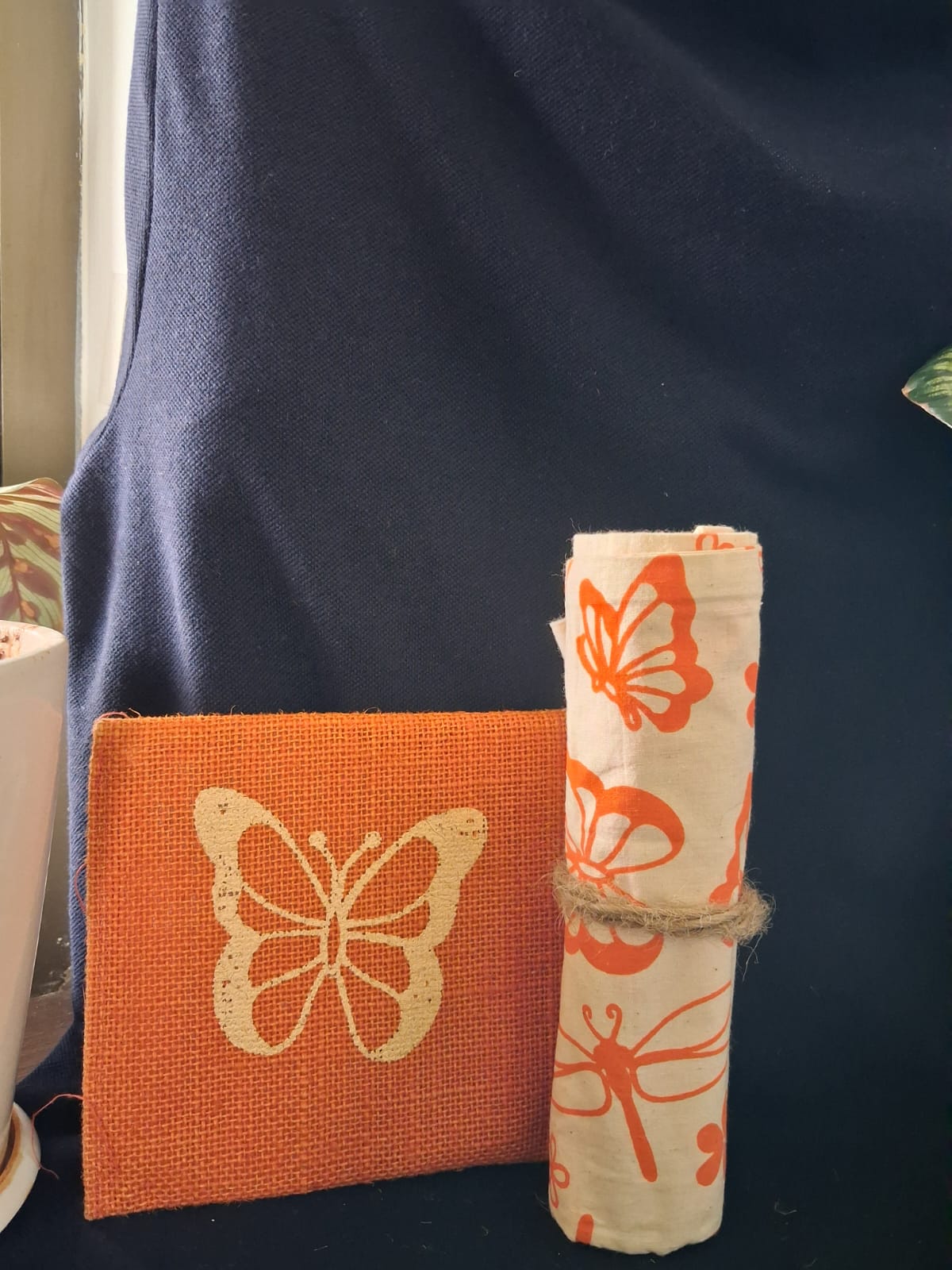 Orange butterfly jute pouch containing a white and orange handmade tote bag